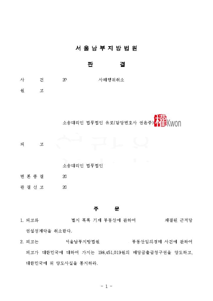 결과: 근저당권 설정계약을 취소하고, 의뢰인이 해당 배당금에 대해 강제집행을 할 수 있도록 길을 열어주었습니다.