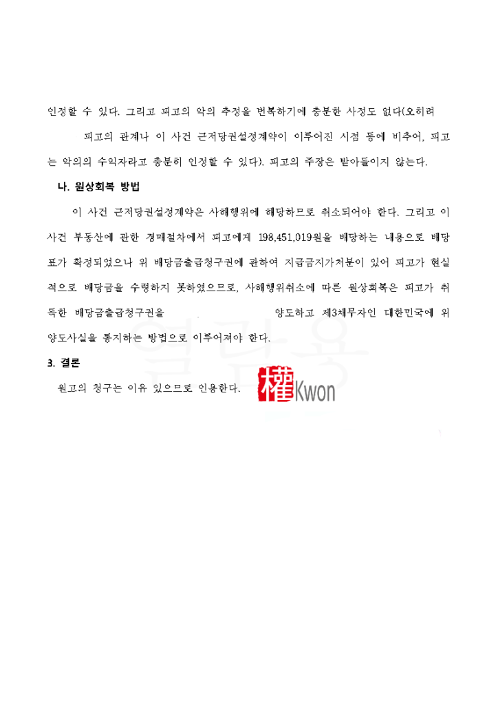 3. 법원 판결: "근저당권 설정을 취소하고 배당금을 회복하라"