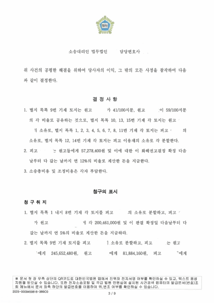 이번 사건은 필지 수가 많고 당사자들이 해외에 거주하여 송달부터 협의까지 난이도가 매우 높았던 사례입니다. 자칫 경매 분할(대금 분할)로 이어져 소중한 토지가 저가에 낙찰될 위험이 있었으나, 치밀한 지분 계산과 전략적인 분할 안 제시를 통해 원고들이 원하는 토지의 소유권을 확보하고 가액 배상까지 받아낼 수 있었습니다.
